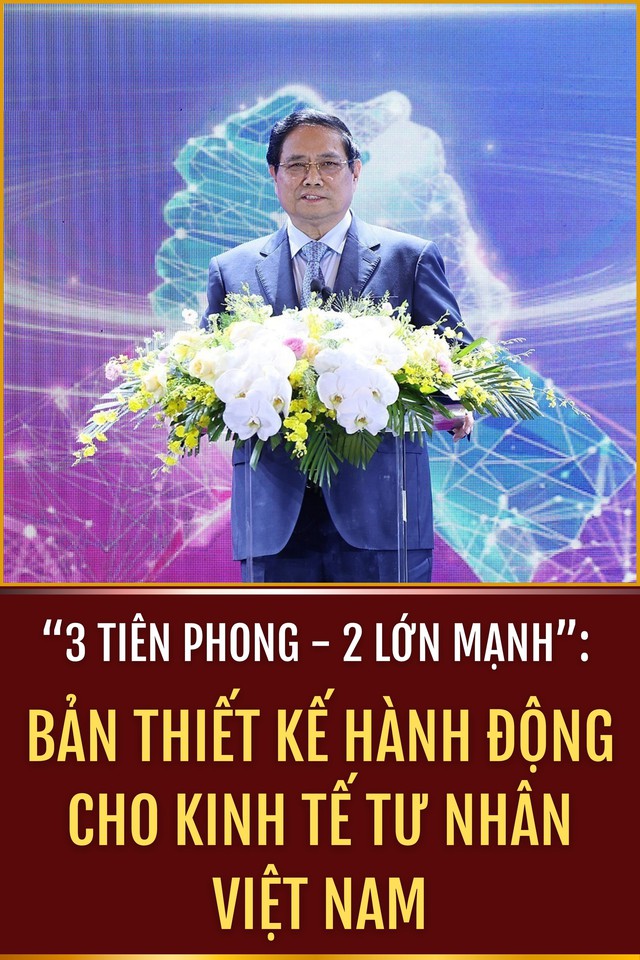 Tại đó, như Thủ tướng khẳng định, cộng đồng doanh nghiệp tư nhân phải thực hiện "3 tiên phong, 2 lớn mạnh" để đạt được 1 mục tiêu xuyên suốt: Kinh tế tư nhân là một động lực quan trọng nhất của nền kinh tế quốc gia, kết hợp hài hòa, hiệu quả với kinh tế nhà nước là chủ đạo, góp phần đưa đất nước bước vào kỷ nguyên mới phát triển giàu mạnh, văn minh, hùng cường, thịnh vượng.