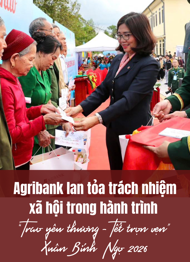 Triển khai đồng bộ chương trình an sinh xã hội "Agribank: Trao yêu thương - Tết trọn vẹn" Xuân Bính Ngọ 2026 trên toàn hệ thống, Agribank tiếp tục khẳng định vai trò của ngân hàng thương mại nhà nước chủ lực trong việc gắn hoạt động kinh doanh với trách nhiệm xã hội. Với tổng nguồn lực trên 100 tỷ đồng, chương trình được tổ chức bài bản, đúng đối tượng tại nhiều địa bàn trọng điểm, từ vùng sâu, vùng xa, biên giới phía Bắc đến miền Trung, Tây Nguyên và các tỉnh, thành phía Nam, qua đó góp phần bảo đảm an sinh xã hội, hỗ trợ người dân đón Tết Nguyên đán an toàn, đủ đầy.