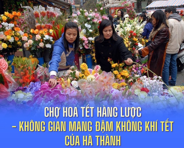 Người dân từ khắp các vùng trồng hoa mang đào, quất và nhiều chủng loại hoa Tết về, tạo nên một không gian náo nhiệt mang đậm không khí Tết của Hà Thành.