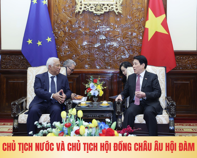 Chủ tịch nước Lương Cường và Chủ tịch Hội đồng châu Âu Antonio Costa hội đàm. Ảnh: Lâm Khánh – TTXVN