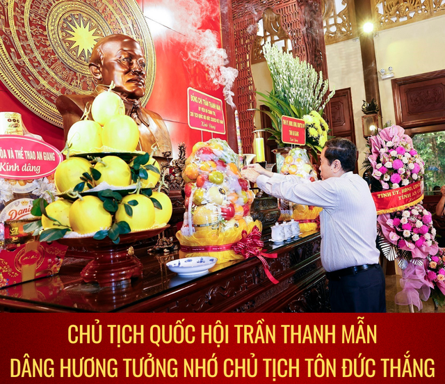Chủ tịch Quốc hội Trần Thanh Mẫn và Đoàn đã dâng hương, dâng hoa, dành một phút mặc niệm, tưởng nhớ những cống hiến to lớn, thể hiện lòng biết ơn sâu sắc đối với Chủ tịch Tôn Đức Thắng - Nhà lãnh đạo mẫu mực, người cộng sản kiên trung, tấm gương đạo đức cách mạng sáng ngời, người con ưu tú của An Giang.