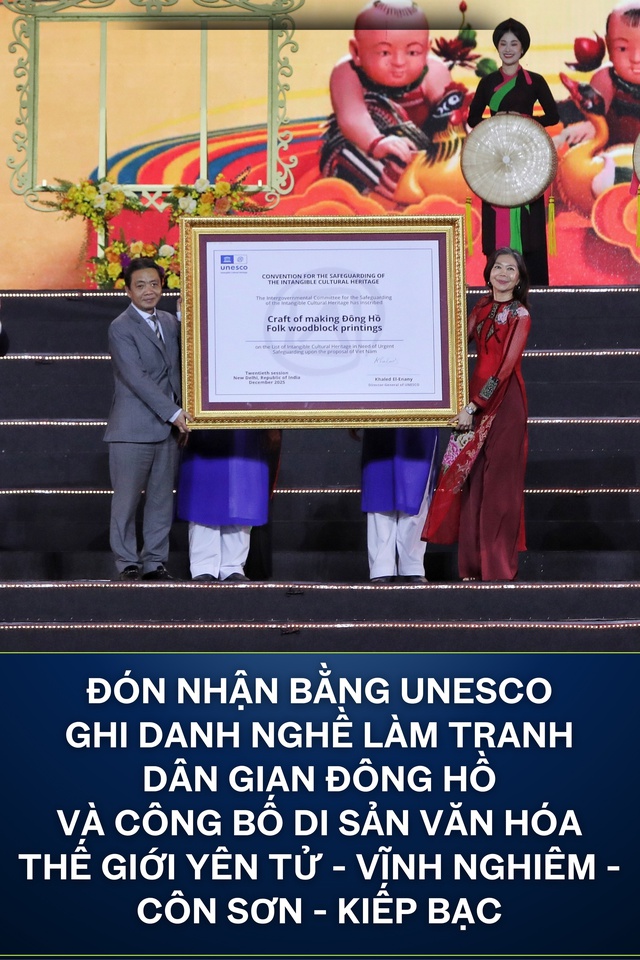 Tại buổi lễ, bà Pauline Tamesis, Điều phối viên thường trú Liên hợp quốc tại Việt Nam trao Bằng của UNESCO ghi danh Nghề làm tranh dân gian Đông Hồ vào Danh sách Di sản văn hóa phi vật thể cần bảo vệ khẩn cấp cho đại diện lãnh đạo Bộ Văn hóa, Thể thao và Du lịch cùng Đảng bộ, chính quyền và nhân dân tỉnh Bắc Ninh.