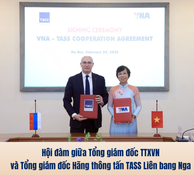 Nhận lời mời của Thông tấn xã Việt Nam, chiều 24/2/2026, tại Trung tâm Thông tấn Quốc gia, Hà Nội, đoàn lãnh đạo Hãng thông tấn TASS (Liên bang Nga) do ông Andrey Kondrashov, Tổng giám đốc dẫn đầu đã đến thăm và làm việc với Thông tấn xã Việt Nam.