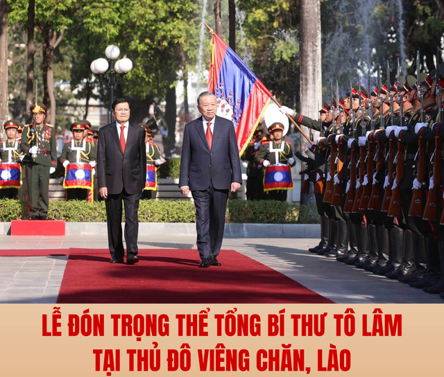 Sáng 5/2, Lễ đón chính thức Tổng Bí thư Tô Lâm cùng đoàn đại biểu cấp cao Việt Nam thăm cấp Nhà nước Cộng hòa Dân chủ Nhân dân Lào đã diễn ra trọng thể tại Phủ Chủ tịch, thủ đô Viêng Chăn (Lào). Cùng dự Lễ đón có Thủ tướng Chính phủ Phạm Minh Chính, Chủ tịch Quốc hội Trần Thanh Mẫn. Tổng Bí thư, Chủ tịch nước Lào Thongloun Sisoulith chủ trì Lễ đón.