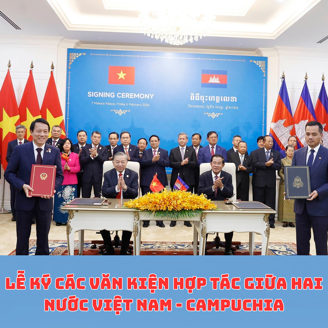 Sáng 6/2/2026, tại Thủ đô Phnom Penh, Tổng Bí thư Tô Lâm và Chủ tịch Đảng Nhân dân Campuchia Samdech Techo Hun Sen chứng kiến lễ ký các văn kiện hợp tác giữa hai nước.