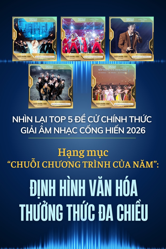 Nhìn lại Top 5 "Chuỗi chương trình của năm" tại Cống hiến 2026, chúng ta thấy được một sự phân bổ vô cùng cân bằng và lớp lang của hệ sinh thái âm nhạc Việt Nam.