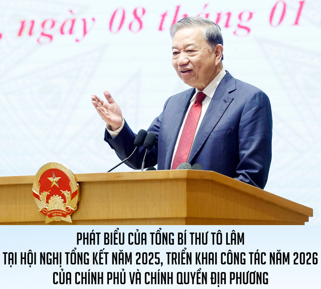 Thay mặt lãnh đạo Đảng và Nhà nước, tôi nhiệt liệt hoan nghênh, ghi nhận, chúc mừng, biểu dương Chính phủ, Thủ tướng Chính phủ, các cấp ủy đảng, chính quyền, đoàn thể, cộng đồng doanh nghiệp, cán bộ, đảng viên, đồng bào, chiến sĩ cả nước và kiều bào ta ở nước ngoài về những nỗ lực phấn đấu và những kết quả, thành tích đã đạt được trong năm 2025 và đặc biệt là trong giai đoạn 2021-2025.