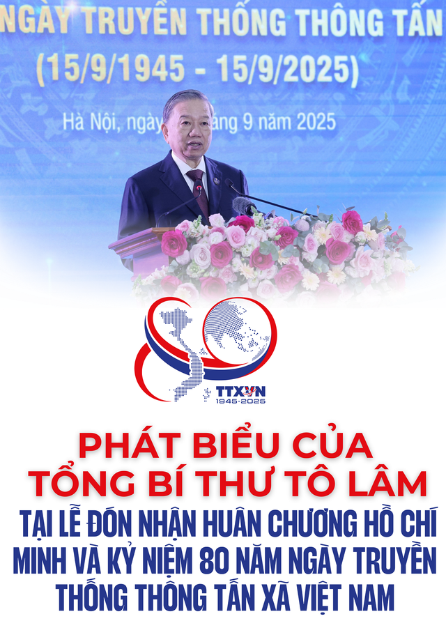Tổng Bí thư Tô Lâm phát biểu tại Lễ đón nhận Huân chương Hồ Chí Minh và kỷ niệm 80 năm Ngày truyền thống Thông tấn xã Việt Nam(15/9/1945-15/9/2025)