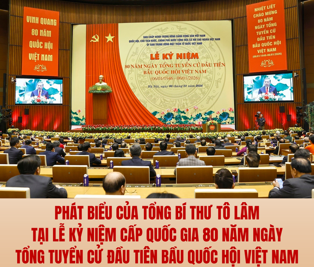 Sáng 6/1, tại Nhà Quốc hội, Ban Chấp hành Trung ương Đảng Cộng sản Việt Nam, Quốc hội, Chủ tịch nước, Chính phủ nước Cộng hòa xã hội chủ nghĩa Việt Nam và Ủy ban Trung ương Mặt trận Tổ quốc Việt Nam tổ chức trọng thể Lễ kỷ niệm cấp quốc gia 80 năm Ngày Tổng tuyển cử đầu tiên bầu Quốc hội Việt Nam (6/1/1946 - 6/1/2026).