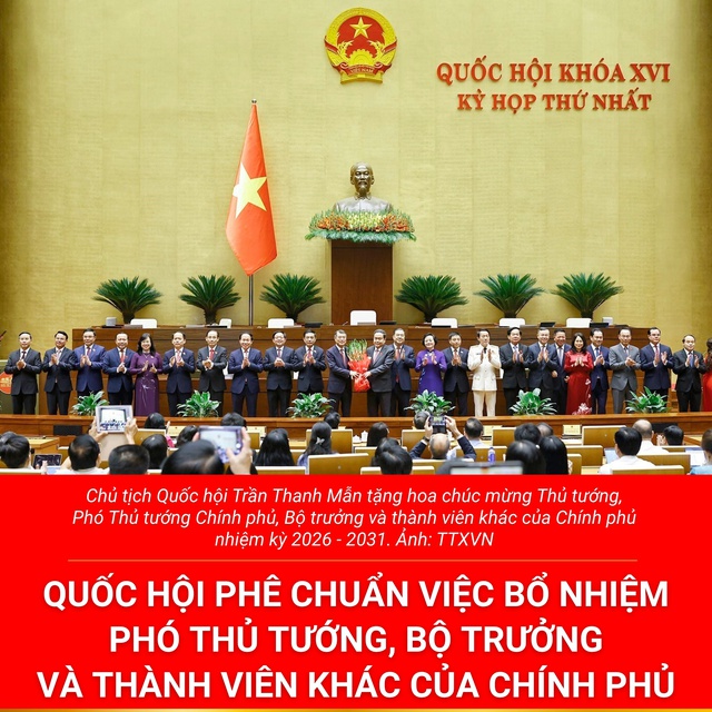 Chủ tịch Quốc hội Trần Thanh Mẫn tặng hoa chúc mừng Thủ tướng, Phó Thủ tướng Chính phủ, Bộ trưởng và thành viên khác của Chính phủ nhiệm kỳ 2026 - 2031. Ảnh: Doãn Tấn - TTXVN