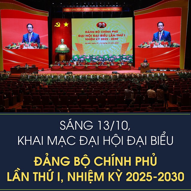 Đại hội đại biểu Đảng bộ Chính phủ lần thứ I, nhiệm kỳ 2025-2030 sẽ khai mạc sáng 13/10, tại Thủ đô Hà Nội. Đại hội có phương châm: “Đoàn kết kỷ cương - Dân chủ đổi mới - Đột phá phát triển - Gần dân, vì dân”.