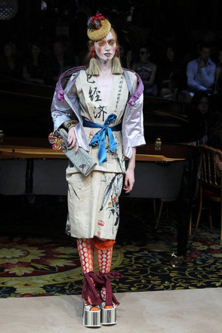 Siêu mẫu được trang điểm mặt nâu khoác lên  trang phục nghệ thuật mang đậm hơi thở Châu Á của NTK Vivienne Westwood.