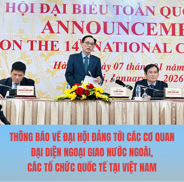 Chiều 7/1, tại Hà Nội, được sự ủy quyền của Ban Chấp hành Trung ương Đảng, đồng chí Lê Hoài Trung, Bí thư Trung ương Đảng, Bộ trưởng Bộ Ngoại giao và các đồng chí: Nguyễn Thanh Bình, Phó Trưởng ban Tổ chức Trung ương; Phan Xuân Thủy, Phó Trưởng ban Tuyên giáo và Dân vận Trung ương đã đồng chủ trì buổi Thông báo về Đại hội đại biểu toàn quốc Đảng Cộng sản Việt Nam lần thứ XIV tới các cơ quan đại diện ngoại giao nước ngoài, các tổ chức quốc tế tại Việt Nam.