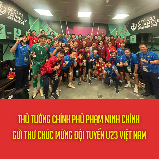 Rạng sáng ngày 24/1/2026, ngay sau chiến thắng tuyệt vời của Đội tuyển bóng đá nam U23 Việt Nam giành Huy chương Đồng tại Giải bóng đá U23 châu Á 2026, Thủ tướng Chính phủ Phạm Minh Chính đã gửi thư chúc mừng Ban huấn luyện và toàn thể Đội tuyển bóng đá nam U23 quốc gia Việt Nam.