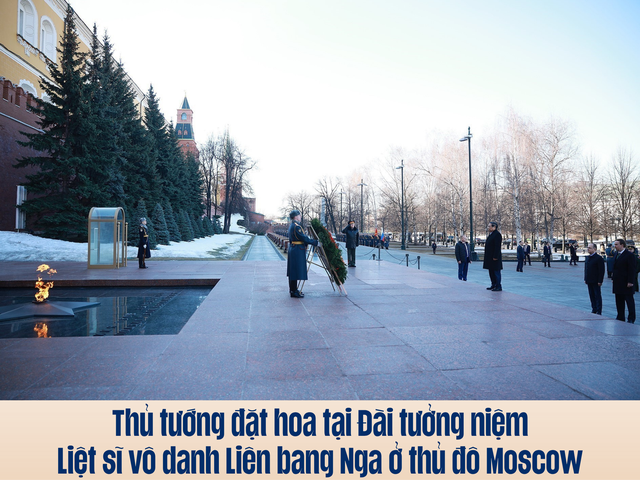 Nhân chuyến thăm chính thức Liên bang Nga, sáng 23/3/2026, giờ địa phương, Thủ tướng Phạm Minh Chính và đoàn đại biểu cấp cao Việt Nam đến đặt hoa tại Đài tưởng niệm Liệt sĩ vô danh Liên bang Nga ở thủ đô Moscow.