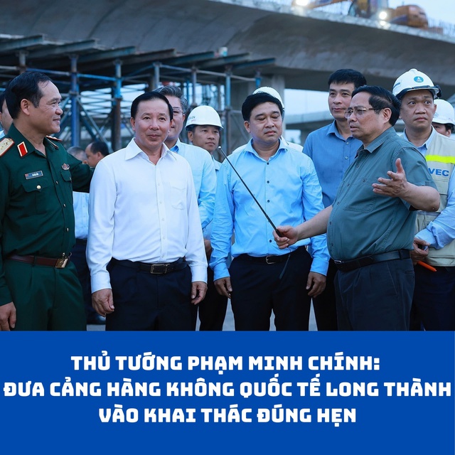 Kiểm tra, động viên các lực lượng đang thi công trên công trường, Thủ tướng Phạm Minh Chính biểu dương, cảm ơn các đơn vị, nhà thầu, đặc biệt là hơn 15.000 chuyên gia, kỹ sư, công nhân đang ngày đêm cùng 3.000 máy móc, thiết bị hối hả thi công, đẩy nhanh tiến độ để vận hành, đón chuyến bay đầu tiên vào ngày 19/12 và đưa Cảng hàng không quốc tế Long Thành vào khai thác thương mại vào nửa đầu năm 2026.