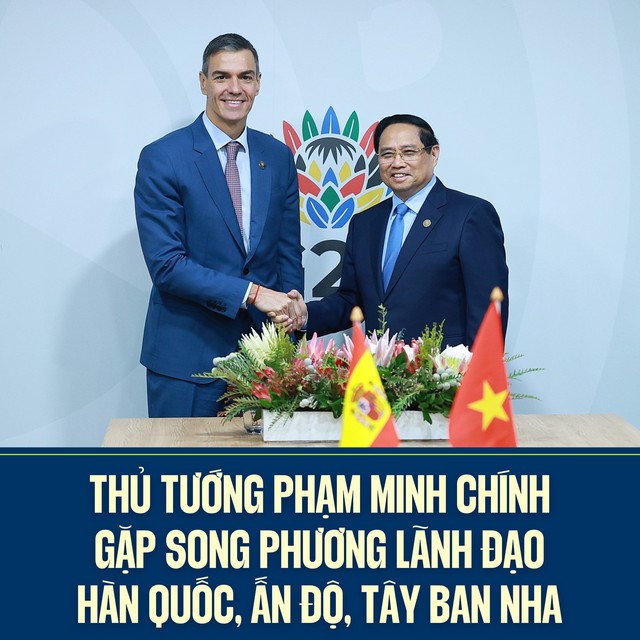 Nhân dự Hội nghị thượng đỉnh Nhóm các nền kinh tế phát triển và mới nổi hàng đầu thế giới (G20) tại Nam Phi, sáng 22/11 theo giờ địa phương, Thủ tướng Chính phủ Phạm Minh Chính đã gặp Tổng thống Hàn Quốc, Thủ tướng Ấn Độ, Thủ tướng Tây Ban Nha để trao đổi và thúc đẩy hợp tác song phương cũng như chia sẻ các vấn quốc tế cùng quan tâm.
