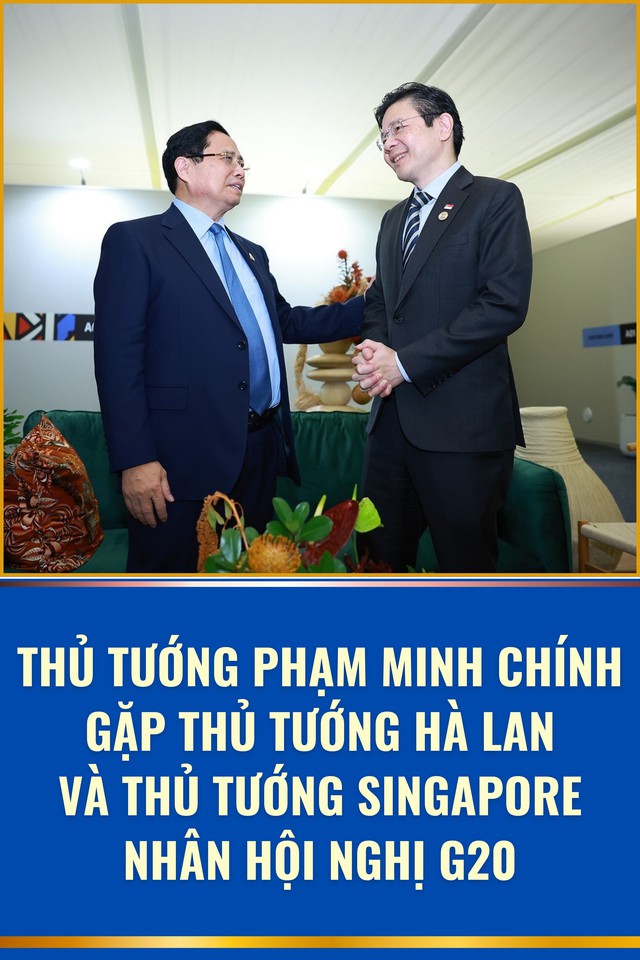 Nhân dịp cùng tham dự Hội nghị thượng đỉnh Nhóm các nền kinh tế phát triển và mới nổi hàng đầu thế giới (G20) tại Cộng hòa Nam Phi, sáng 23/11, Thủ tướng Phạm Minh Chính đã có các cuộc gặp với Thủ tướng Hà Lan Dick Schoof và Thủ tướng Singapore Lawrence Wong.