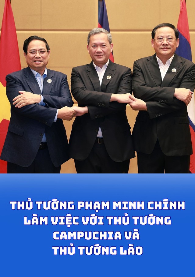Thủ tướng Phạm Minh Chính cùng Thủ tướng Campuchia Hun Manet và Thủ tướng Lào Sonexay Siphandone. Ảnh: Dương Giang-TTXVN