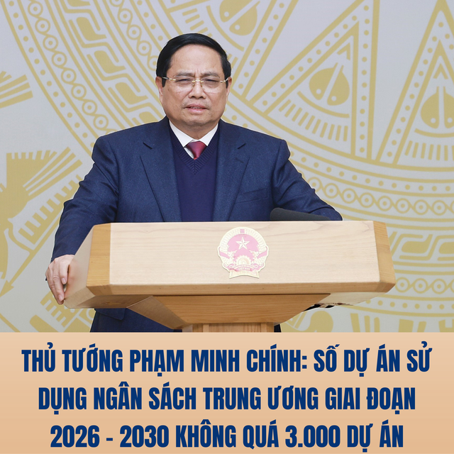 Chỉ đạo việc giao vốn, phân bổ chi tiết kế hoạch đầu tư công vốn ngân sách Nhà nước năm 2026, Thủ tướng Chính phủ yêu cầu các bộ, ngành, địa phương khẩn trương giao ngay cho các nhiệm vụ, dự án theo đúng quy định với tinh thần có trọng tâm, trọng điểm, ưu tiên cho các công trình, dự án trọng điểm, quan trọng quốc gia. "Đảm bảo số dự án đầu tư công sử dụng vốn ngân sách Trung ương giai đoạn 2026-2030 là 3.000 dự án; chấm dứt tình trạng đầu tư dàn trải", Thủ tướng nhấn mạnh.
