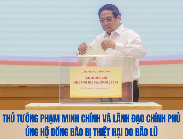 Sáng 3/10, tại Trụ sở Chính phủ, Thủ tướng Phạm Minh Chính cùng các Phó Thủ tướng, Phó Bí thư Đảng ủy Chính phủ, tập thể Văn phòng Chính phủ và cơ quan giúp việc Đảng ủy Chính phủ đã tham gia ủng hộ đồng bào bị thiệt hại do bão, lũ gây ra với tinh thần tương thân, tương ái, tình dân tộc, nghĩa đồng bào, “lá lành đùm lá rách”, ít nhất mỗi người một ngày lương.