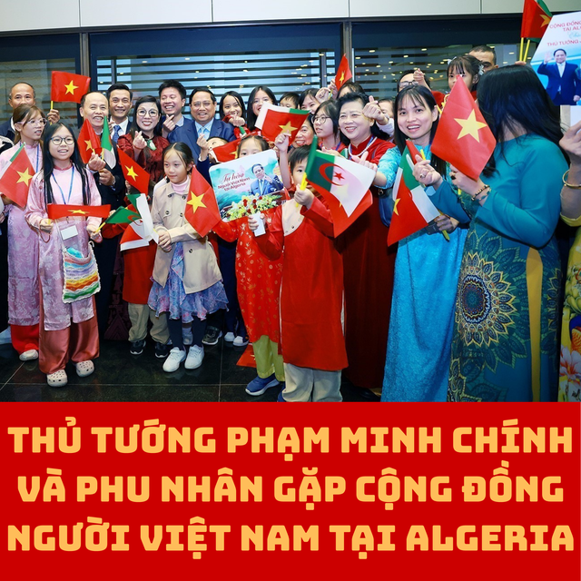 Ngay sau khi tới Algeria, Thủ tướng Chính phủ Phạm Minh Chính cùng Phu nhân và Đoàn đại biểu cấp cao Việt Nam đã có buổi gặp mặt thân mật cán bộ, nhân viên Đại sứ quán và cộng đồng người Việt Nam tại Algeria.