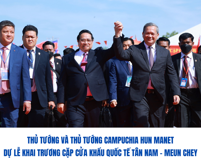 Sáng 8/12, Thủ tướng Chính phủ Phạm Minh Chính cùng Thủ tướng Vương quốc Campuchia Samdech Thipadei Hun Manet đồng chủ trì lễ khai trương cặp cửa khẩu quốc tế Tân Nam (tỉnh Tây Ninh) - Meun Chey (tỉnh Prey Veng, Campuchia).