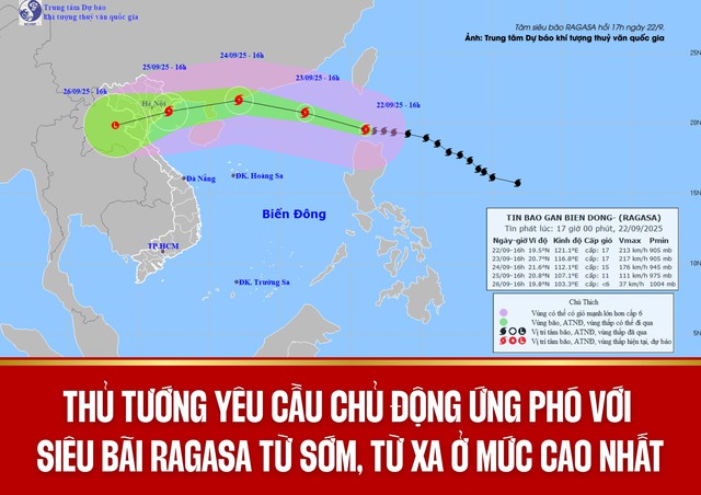 Theo dự báo của Trung tâm Dự báo Khí tượng Thủy văn quốc gia, khoảng tối nay (ngày 22/9) bão Ragasa sẽ di chuyển vào Biển Đông (cơn bão số 9 trên Biển Đông trong năm 2025). Sau khi vào Biển Đông, bão di chuyển nhanh hơn với tốc độ khoảng 20 km/giờ và duy trì cường độ cực đại cấp 16-17, giật trên cấp 17 trong các ngày 22-23/9 (sức gió tương đương và mạnh hơn cường độ cực đại của cơn bão Yagi năm 2024), sóng biển cao trên 10m, biển động dữ dội, đặc biệt nguy hiểm cho tàu thuyền hoạt động ở khu vực Bắc và giữa Biển Đông. Từ ngày 24/9, khả năng bão sẽ giảm dần cấp độ, đêm 24 đến rạng sáng 25/9, bão sẽ vượt qua đảo Lôi Châu (Trung Quốc) vào khu vực Vịnh Bắc Bộ với cường độ bão vẫn mạnh cấp 12-14, giật cấp 15-16 và dự báo trong ngày 25/9 bão có thể độ bộ trực tiếp vào đất liền nước ta tại khu vực từ Quảng Ninh đến Hà Tĩnh.