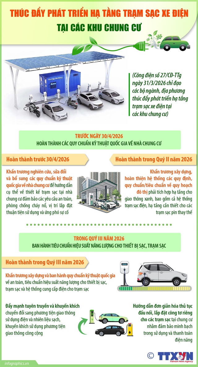Thủ tướng Chính phủ Phạm Minh Chính ký Công điện số 27/CĐ-TTg ngày 31/3/2026 chỉ đạo các bộ ngành, địa phương thúc đẩy phát triển hạ tầng trạm sạc xe điện tại các khu chung cư.