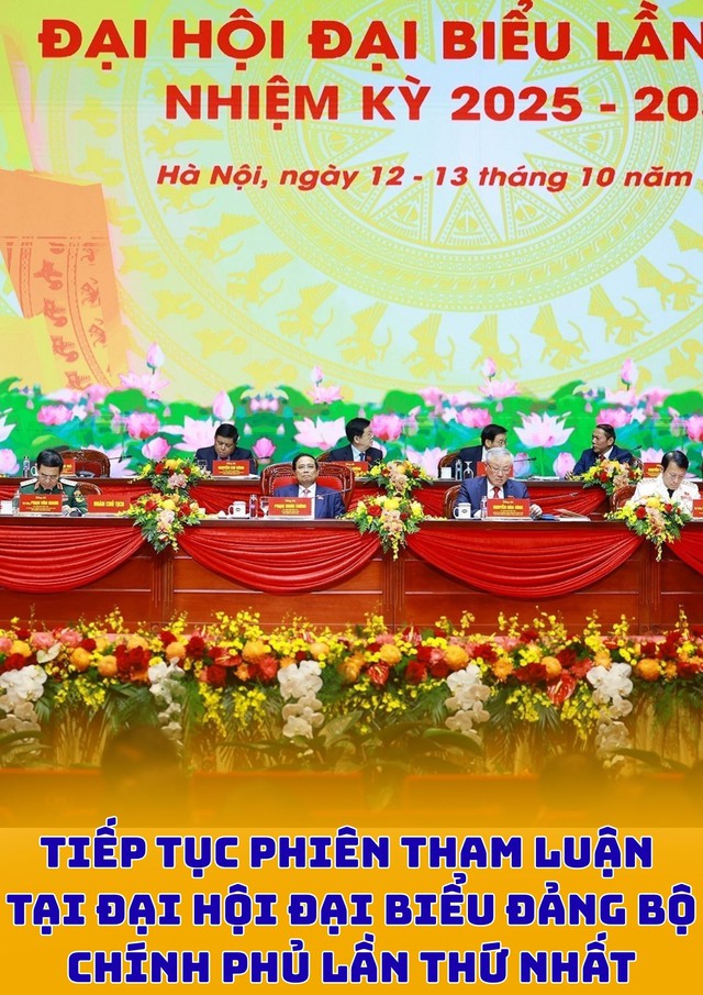 Chiều 13/10/2025, tại Hà Nội, Đại hội đại biểu Đảng bộ Chính phủ lần thứ nhất, nhiệm kỳ 2025 -2030 tiếp tục diễn ra với các nội dung: Nghe trình bày báo cáo tổng hợp góp ý vào dự thảo các văn kiện trình Đại hội XIV của Đảng; Công bố Quyết định của Bộ Chính trị chỉ định Đoàn đại biểu Đảng bộ Chính phủ dự Đại hội đại biểu toàn quốc lần thứ XIV của Đảng; nghe trình bày tham luận tại hội trường.