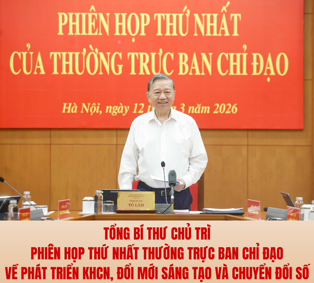 Chiều 12/3/2026, tại Trụ sở Trung ương Đảng, Tổng Bí thư Tô Lâm, Trưởng Ban Chỉ đạo Trung ương về phát triển khoa học, công nghệ, đổi mới sáng tạo và chuyển đổi số chủ trì phiên họp thứ nhất của Thường trực Ban chỉ đạo năm 2026.