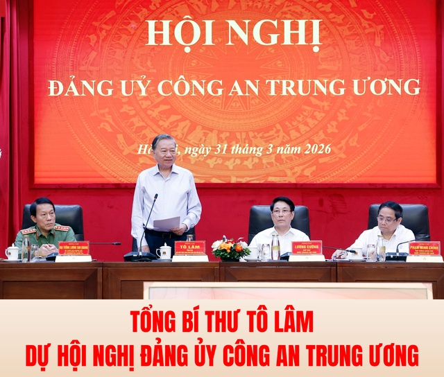 Sáng 31/3/2026, tại Hà Nội, Tổng Bí thư Tô Lâm dự và phát biểu chỉ đạo tại Hội nghị Đảng uỷ Công an Trung ương. Cùng dự có Chủ tịch nước Lương Cường, Thủ tướng Phạm Minh Chính, Chủ tịch Quốc hội Trần Thanh Mẫn.
