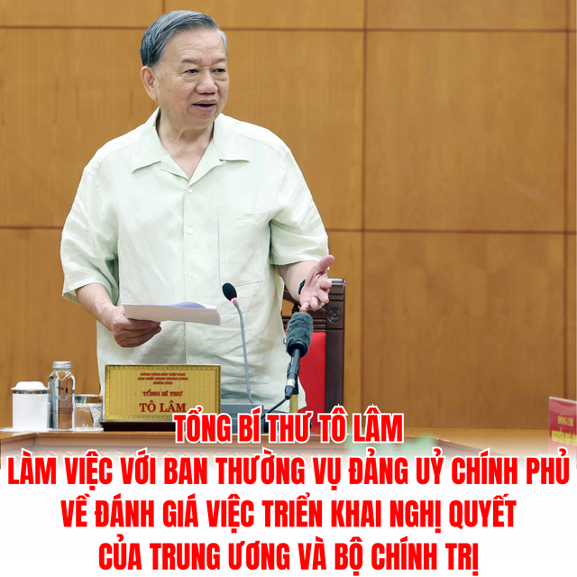 Sáng 17/9/2025, tại Trụ sở Trung ương Đảng, Tổng Bí thư Tô Lâm chủ trì cuộc làm việc với Ban Thường vụ Đảng uỷ Chính phủ về đánh giá việc triển khai Nghị quyết số 19 - NQ /TW của Trung ương và Nghị quyết số 06 - NQ /TW của Bộ Chính trị.