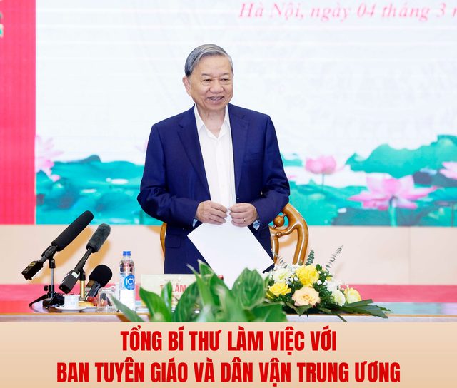 Chiều 4/3, tại Hà Nội, Tổng Bí thư Tô Lâm đã làm việc với Ban Tuyên giáo và Dân vận Trung ương về việc chuẩn bị nội dung “Quy định về công tác chính trị, tư tưởng trong Đảng”.