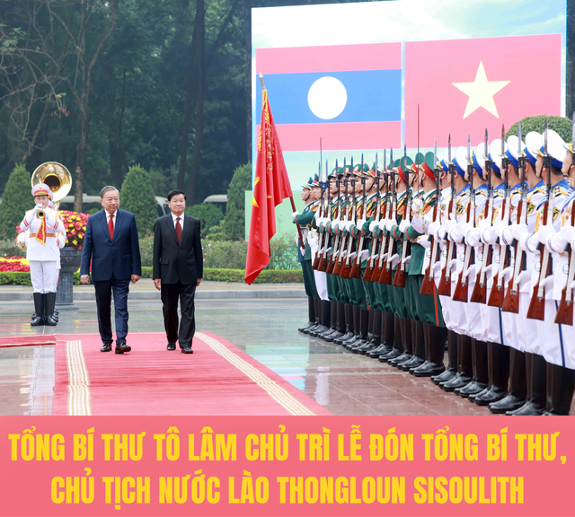 Tiếp đó, Tổng Bí thư Tô Lâm trân trọng mời Tổng Bí thư, Chủ tịch nước Lào Thongloun Sisoulith bước lên bục danh dự. Những loạt đại bác vang lên hùng tráng. Quân nhạc cử quốc thiều hai nước. Tổng Bí thư Tô Lâm mời Tổng Bí thư, Chủ tịch nước Lào Thongloun Sisoulith duyệt Đội Danh dự Quân đội nhân dân Việt Nam. Sau duyệt Đội danh dự, Tổng Bí thư Tô Lâm và Tổng Bí thư, Chủ tịch nước Lào Thongloun Sisoulith giới thiệu các thành viên Đoàn Cấp cao hai nước tại Lễ đón. Hai nhà Lãnh đạo trở lại bục danh dự, cùng chứng kiến phần diễu binh chào mừng của Đội Danh dự Quân đội nhân dân Việt Nam.