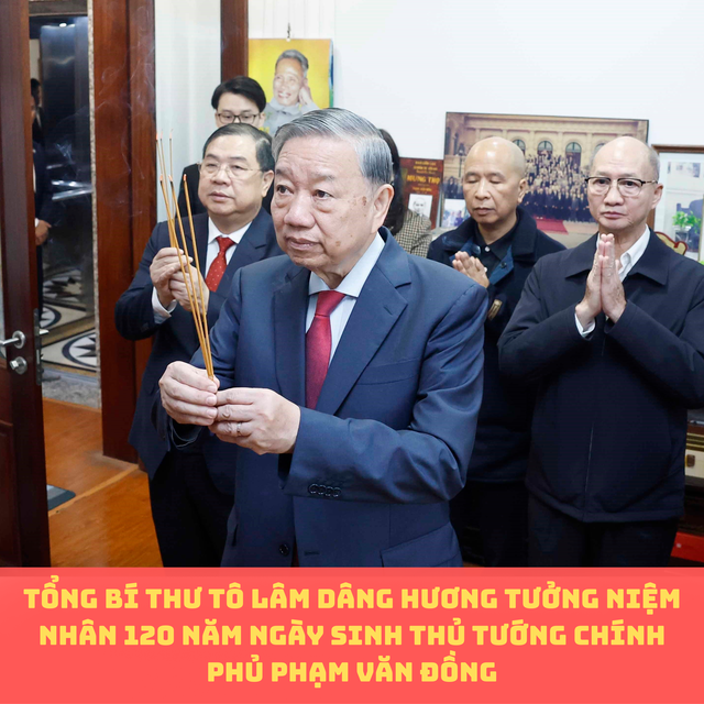 Xúc động thắp nén hương thơm, Tổng Bí thư Tô Lâm bày tỏ lòng kính trọng và biết ơn sâu sắc công lao to lớn của Thủ tướng Chính phủ Phạm Văn Đồng, người học trò xuất sắc, người đồng chí tin cậy, gần gũi của Chủ tịch Hồ Chí Minh, một chiến sỹ cách mạng vô sản kiên cường; một trong những nhà lãnh đạo chủ chốt, tiền bối của cách mạng Việt Nam; có công lao to lớn trong sự nghiệp đấu tranh giải phóng dân tộc, xây dựng và bảo vệ Tổ quốc.