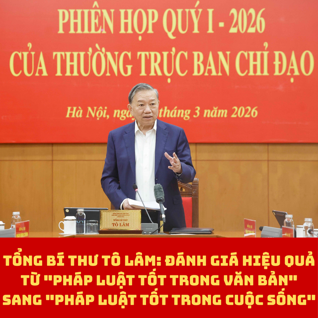 Về báo cáo kết quả công tác hoàn thiện thể chế pháp luật và phương hướng nhiệm vụ trọng tâm trong thời gian tới, Tổng Bí thư lưu ý các thành viên Ban Chỉ đạo phối hợp chặt chẽ với Đảng ủy Quốc hội, Đảng ủy Chính phủ, Đảng ủy các bộ, ngành và các tỉnh ủy, thành ủy kịp thời khắc phục các tồn tại, hạn chế mà Báo cáo đã chỉ ra và tập trung thực hiện hiệu quả Chương trình công tác năm 2026 của Ban Chỉ đạo Trung ương về hoàn thiện thể chế, pháp luật. Trọng tâm là thực hiện các định hướng hoàn thiện thể chế, pháp luật tại Nghị quyết Đại hội đại biểu toàn quốc lần thứ XIV của Đảng và các Nghị quyết của Trung ương, Bộ Chính trị được ban hành trong thời gian gần đây, góp phần hoàn thiện hệ thống pháp luật Việt Nam trong kỷ nguyên mới; tiếp tục đổi mới mạnh mẽ tư duy xây dựng và thi hành pháp luật, đưa thể chế và pháp luật trở thành lợi thế cạnh tranh và động lực kiến tạo phát triển để góp phần hiện thực hóa hai mục tiêu 100 năm của đất nước. Quá trình xây dựng pháp luật phải được chuẩn bị kỹ lưỡng ngay từ khâu xây dựng chính sách, dựa trên tổng kết thực tiễn, tham vấn rộng rãi người dân, doanh nghiệp và các chuyên gia, các nhà khoa học; đồng thời chú trọng nâng cao hiệu quả tổ chức thực hành pháp luật, đảm bảo pháp luật thực sự đi vào cuộc sống, phải chuyển được tư duy đánh giá hiệu quả từ "pháp luật tốt trong văn bản" sang "pháp luật tốt trong cuộc sống".