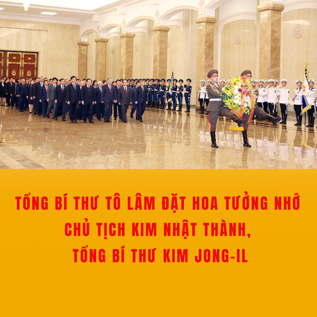 Tổng Bí thư Tô Lâm cùng Đoàn đại biểu cấp cao Việt Nam đến đặt hoa tưởng nhớ Chủ tịch Kim Nhật Thành, Tổng Bí thư Kim Jong-il tại Cung Thái Dương ở Thủ đô Bình Nhưỡng