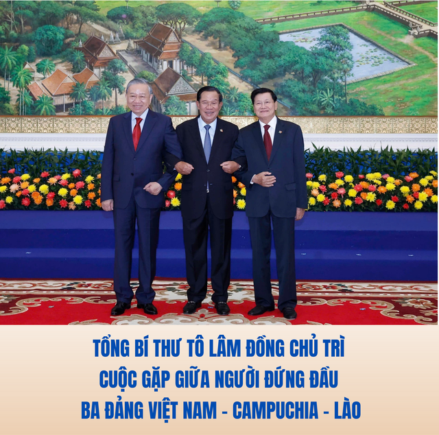 Chiều 6/2, tại trụ sở Đảng Nhân dân Campuchia (CPP), Tổng Bí thư Tô Lâm cùng Chủ tịch CPP Hun Sen và Tổng Bí thư Đảng Nhân dân Cách mạng Lào Thongloun Sisoulith đã đồng chủ trì Cuộc gặp giữa Người đứng đầu ba Đảng Việt Nam - Campuchia - Lào. Cùng dự cuộc gặp có Thủ tướng ba nước, Chủ tịch Quốc hội Việt Nam và Chủ tịch Quốc hội Campuchia.