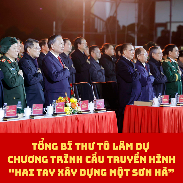 Tổng Bí thư Tô Lâm, các đồng chí lãnh đạo, nguyên lãnh đạo Đảng, Nhà nước dự Cầu truyền hình "Hai tay xây dựng một sơn hà” tại điểm cầu Cao Bằng. Ảnh: Thống Nhất - TTXVN