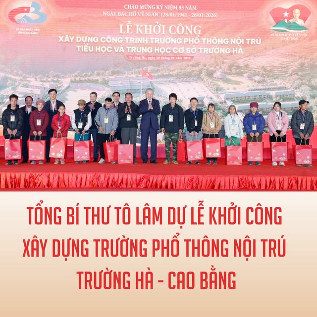Tiếp tục chương trình công tác tại Cao Bằng, chiều 28/1, Tổng Bí thư Tô Lâm và Đoàn công tác của Trung ương đã dự Lễ khởi công xây dựng công trình Trường Phổ thông nội trú Tiểu học và Trung học Cơ sở Trường Hà (xã Trường Hà, tỉnh Cao Bằng).