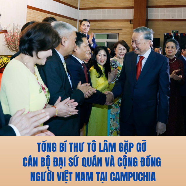 Trong chuyến thăm cấp Nhà nước tới Vương quốc Campuchia, chiều 6/2, tại thủ đô Phnom Penh, Tổng Bí thư Tô Lâm đã có cuộc gặp gỡ cán bộ, nhân viên Đại sứ quán Việt Nam tại Campuchia và cộng đồng người Việt Nam đang sinh sống, làm việc và học tập tại đất nước Chùa Tháp.