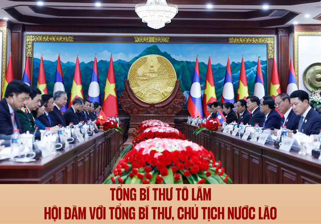 Sau lễ đón chính thức trọng thể Tổng Bí thư Tô Lâm và Phu nhân cùng Đoàn đại biểu cấp cao Đảng, Nhà nước Việt Nam tại Phủ Chủ tịch theo nghi thức cao nhất dành cho nguyên thủ quốc gia, Tổng Bí thư Tô Lâm đã hội đàm với Tổng Bí thư, Chủ tịch nước Lào Thongloun Sisoulith.