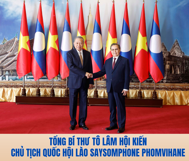 Tổng Bí thư Tô Lâm bày tỏ vui mừng thăm cấp Nhà nước tới Lào trên cương vị Tổng Bí thư Ban Chấp hành Trung ương Đảng Cộng sản Việt Nam khóa XIV; vui mừng được gặp lại Chủ tịch Quốc hội Lào Saysomphone Phomvihane, đồng thời chúc mừng đồng chí tiếp tục được tín nhiệm tái đắc cử vào Bộ Chính trị Ban Chấp hành Trung ương Đảng Nhân dân Cách mạng Lào khóa XII.