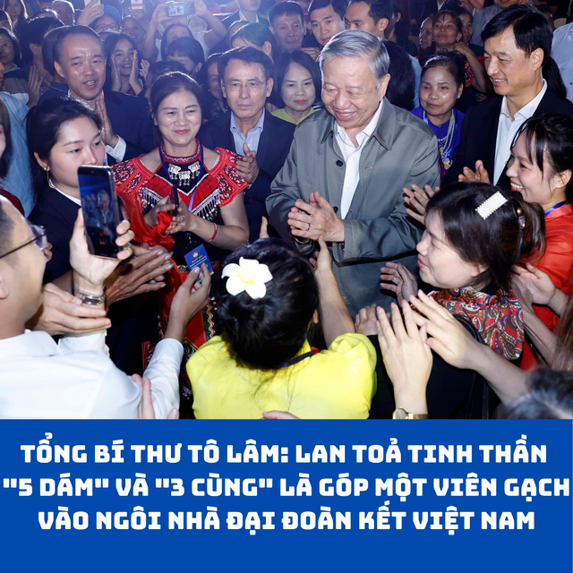 Tổng Bí thư mong muốn, hãy khắc ghi và lan tỏa tinh thần "5 dám" (dám nghĩ, dám nói, dám làm, dám chịu trách nhiệm, dám đổi mới sáng tạo vì lợi ích chung) và "3 cùng" (cùng bàn, cùng làm, cùng hưởng), nếu thực hiện như vậy là đã góp một viên gạch bền chắc vào ngôi nhà đại đoàn kết Việt Nam.
