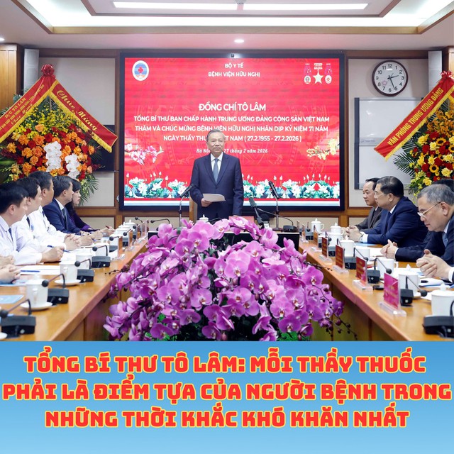 Trong không khí ấm áp của mùa Xuân Bính Ngọ, với khí thế, niềm tin và khát vọng phát triển đất nước trong kỷ nguyên mới, chiều 27/2, tại Hà Nội, Tổng Bí thư Tô Lâm đã đến thăm, chúc mừng cán bộ, bác sĩ, nhân viên y tế Bệnh viện Hữu nghị nhân dịp kỷ niệm 71 năm Ngày Thầy thuốc Việt Nam (27/2/1955 – 27/2/2026).