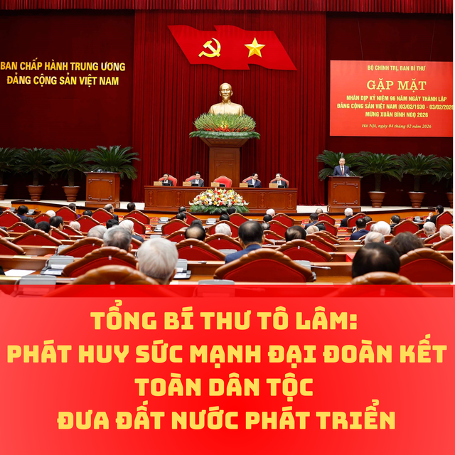 Tổng Bí thư nhấn mạnh, cuộc gặp mặt đầy ý nghĩa diễn ra đúng vào dịp kỷ niệm 96 năm Ngày thành lập Đảng Cộng sản Việt Nam, càng làm sâu sắc thêm niềm tự hào và niềm tin vững chắc đối với chặng đường cách mạng vẻ vang của Đảng. Chín mươi sáu năm qua là bản hùng ca của trí tuệ, bản lĩnh và khát vọng độc lập, tự do; là hành trình Đảng ta kiên định mục tiêu, lý tưởng, gắn bó máu thịt với nhân dân, tự đổi mới, tự chỉnh đốn, lãnh đạo dân tộc đi từ thắng lợi này đến thắng lợi khác, đưa đất nước vững vàng bước vào kỷ nguyên phát triển mới.