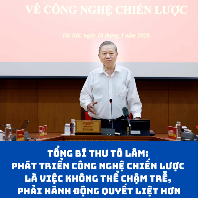 Tổng Bí thư khẳng định, phát triển công nghệ chiến lược là việc không thể chậm trễ hơn nữa, phải hành động mạnh hơn, quyết liệt hơn, hiệu quả hơn. Điều đất nước cần lúc này không chỉ là quyết tâm chính trị, mà là kết quả cụ thể; không chỉ là những văn bản đúng, mà là những việc làm đúng và làm đến cùng; không chỉ là sự vào cuộc trên giấy tờ, mà là sự chuyển động thực sự của cả hệ thống chính trị, cộng đồng doanh nghiệp, đội ngũ trí thức, nhà khoa học và toàn xã hội.