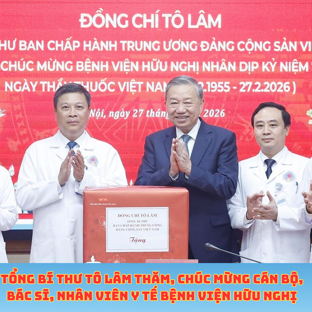 Nhân dịp kỷ niệm 71 năm Ngày Thầy thuốc Việt Nam (27/2/1955 – 27/2/2026), chiều 27/2/2026, tại Hà Nội, Tổng Bí thư Tô Lâm đến thăm, chúc mừng cán bộ, nhân viên y tế Bệnh viện Hữu nghị.