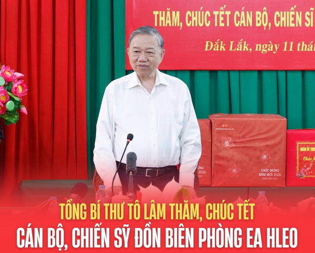 Nhân dịp Tết Nguyên đán Bính Ngọ năm 2026, Tổng Bí thư chúc toàn thể cán bộ, chiến sĩ Đồn Biên phòng Ea H’Leo cùng gia đình sức khỏe, hạnh phúc, an khang, thịnh vượng; tiếp tục đoàn kết, nỗ lực, hoàn thành xuất sắc mọi nhiệm vụ được giao.